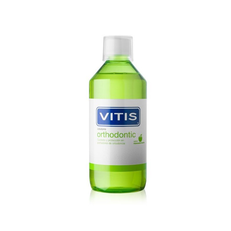 Vitis Orthodontic Colutorio es un enjuague de uso diario formulado especialmente para la higiene bucal diaria de los portadores de ortodoncia.